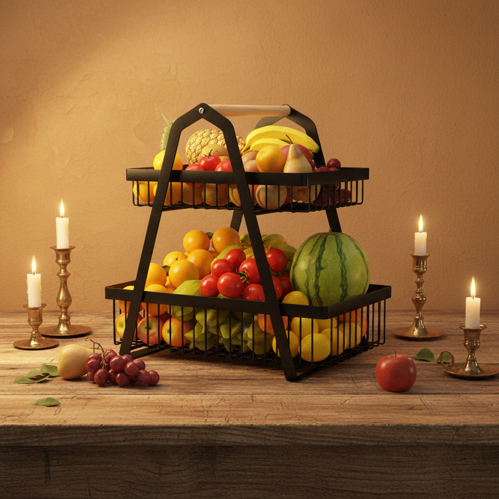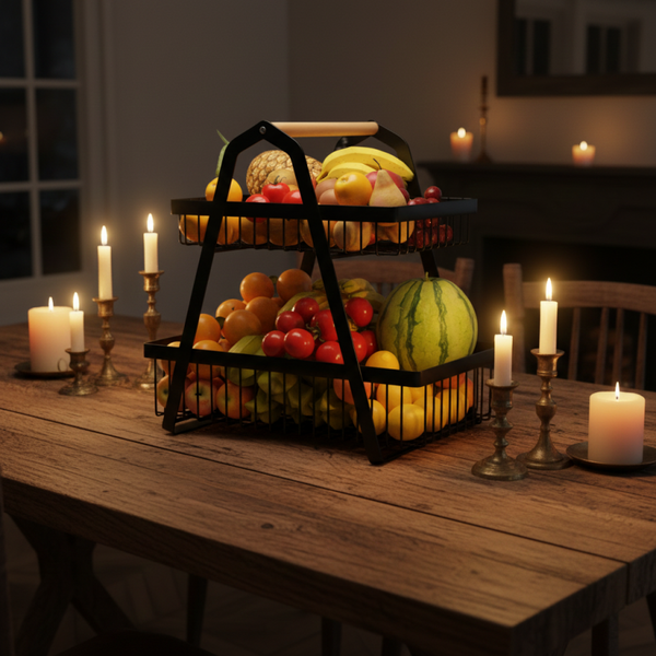 Kom jij ook ruimte te kort in je fruitschaal en kan je er ook zo van genieten om al het verse fruit en groenten in mooie verschillende kleuren bij elkaar te zien? Deze ruime fruitschaal met 2 afneembare manden heeft genoeg plaats voor heel wat bananen, manderijnen, appels en peren. Deze luxe fruitschaal is gemaakt van metaal en voorzien van 2 ruime stevige manden en een handig handvat. Door het open frame is er genoeg ademruimte en blijft je fruit of groente langer vers vanwege de betere luchtcirculatie.