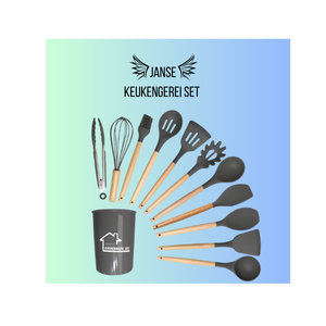 Deze set bestaat uit 12 delen, waaronder verschillende soorten siliconen kookgerei en een handige houder voor opberging.