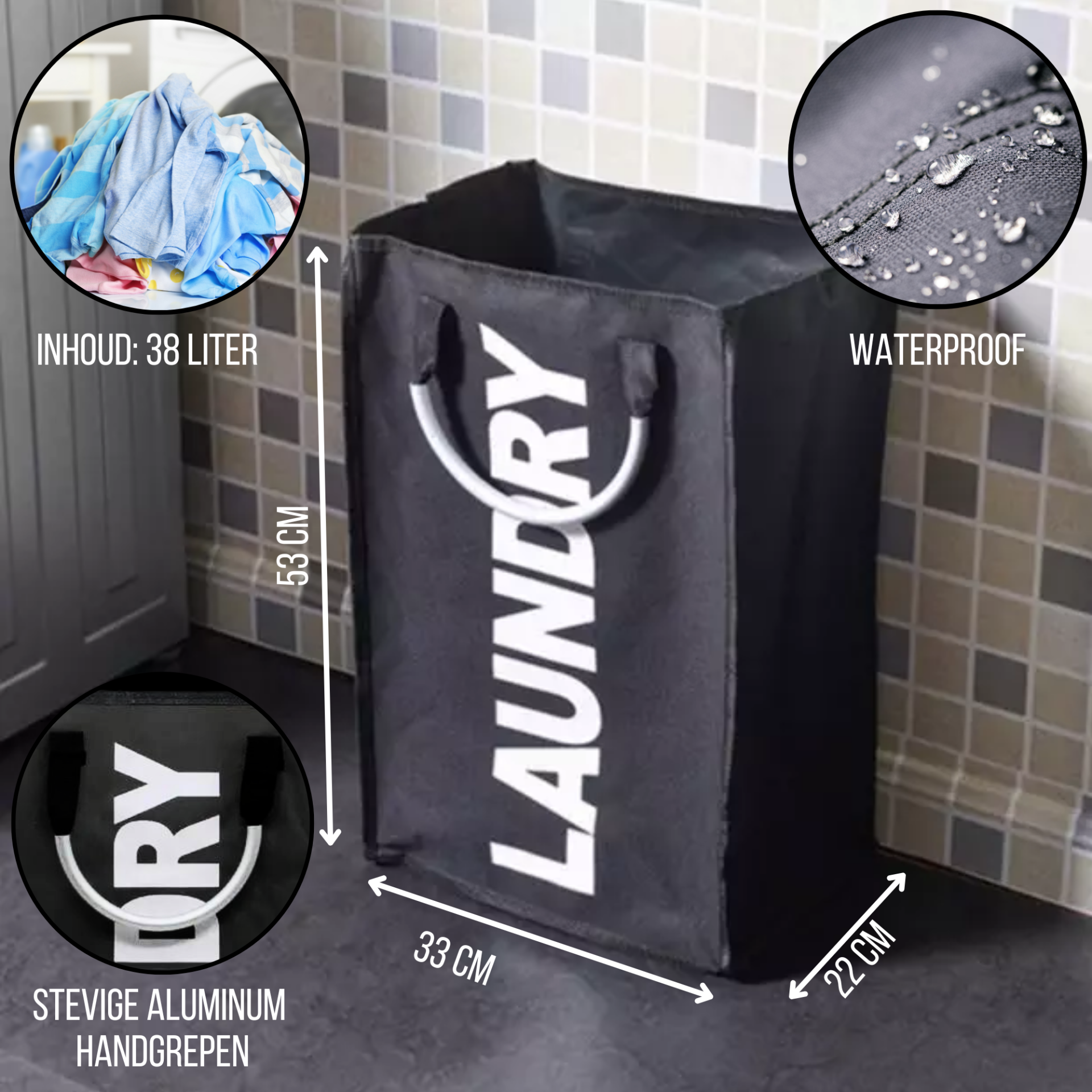 De wasmand is 33 cm breed en 22 cm lang en is 53 cm hoog. als de wasmand vol is kan het wat breder uitvallen.