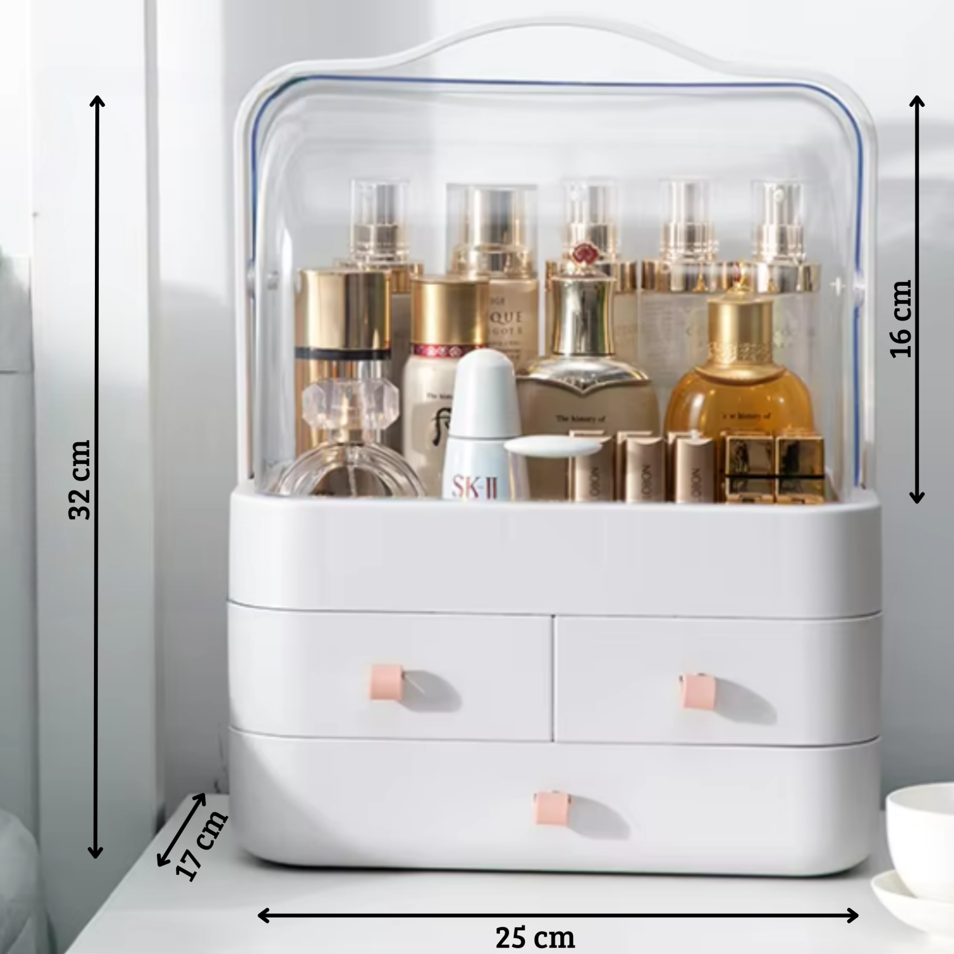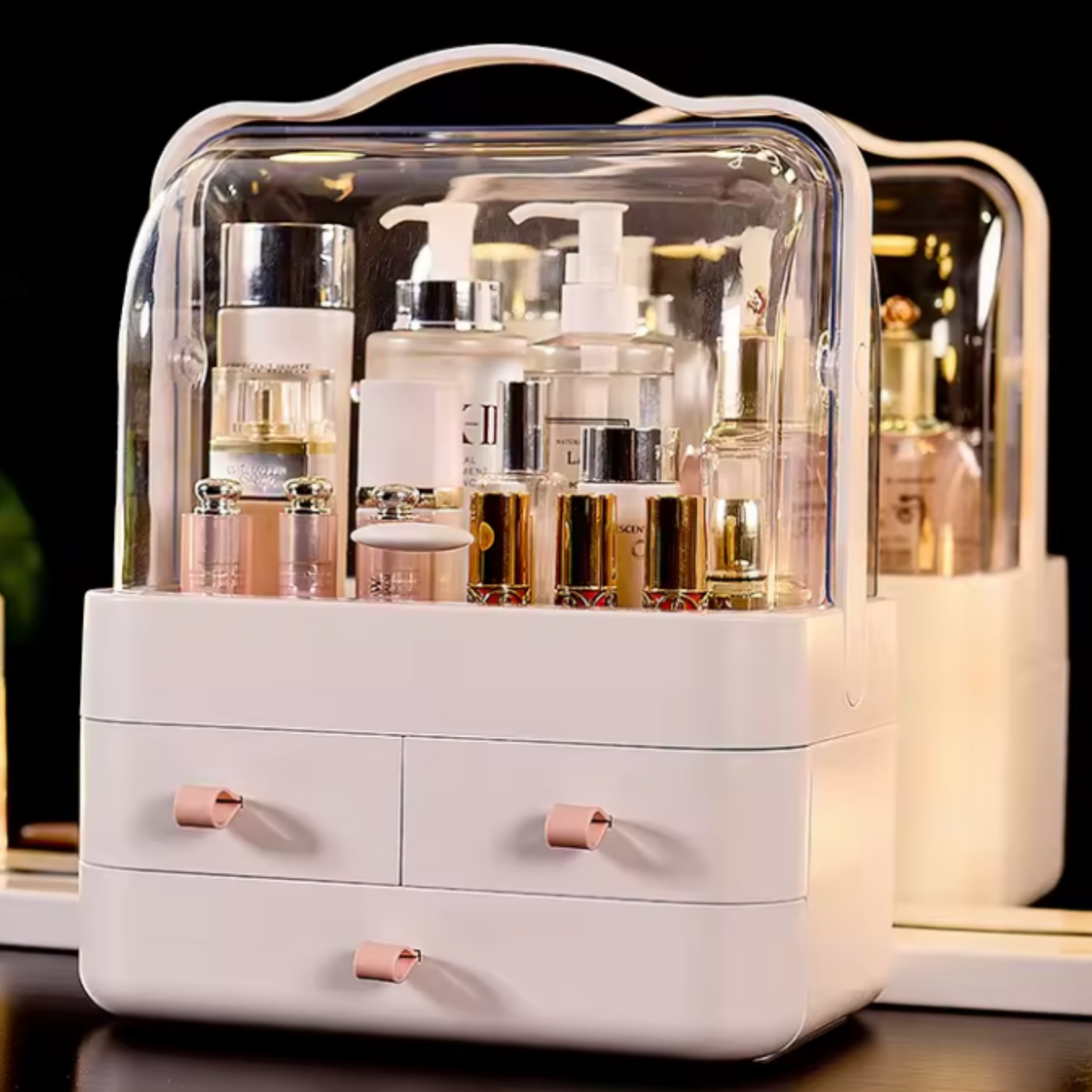 De witte organizer met lichtroze handvatten geeft een luxe uitstraling aan jouw make-up collectie.