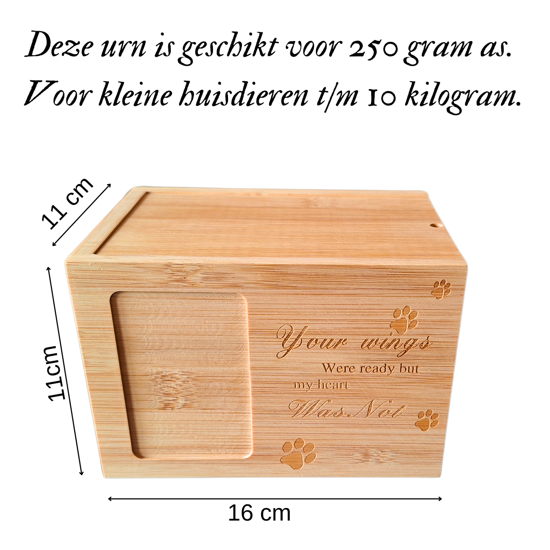 Heb je een geliefd huisdier verloren en zoek je een speciale manier om hen te herdenken? Ontdek dan onze prachtige houten dieren urn van het merk Janse. Met de ontroerende tekst "Your wings were ready but my heart was not" en kleine poot afdrukken, biedt deze gedenkurn een mooie manier om je huisdier te eren. Er is zelfs ruimte voor een foto om hun herinnering levend te houden. Laat je dierbare vriend voor altijd dicht bij je hart zijn.