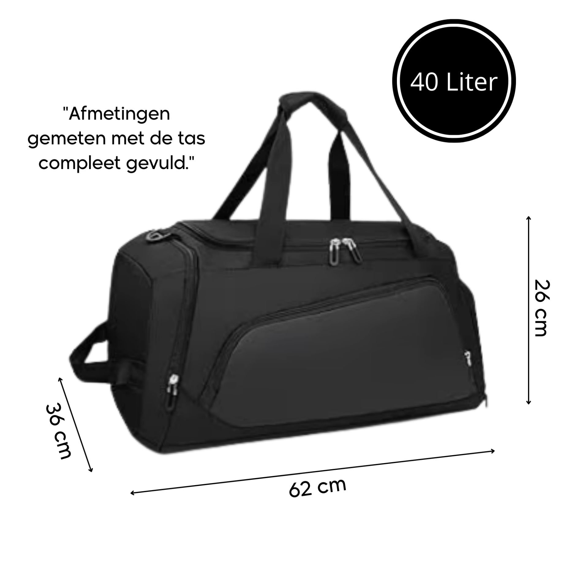 De buitenmaten van de sporttas zijn 62x36x26 centimeter wanneer de tas helemaal vol zit. Hierdoor heb je voldoende ruimte om al je sport- of reisspullen mee te nemen.