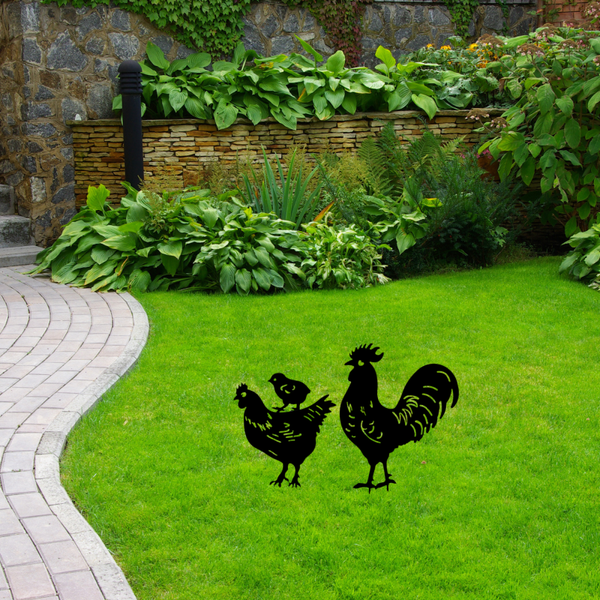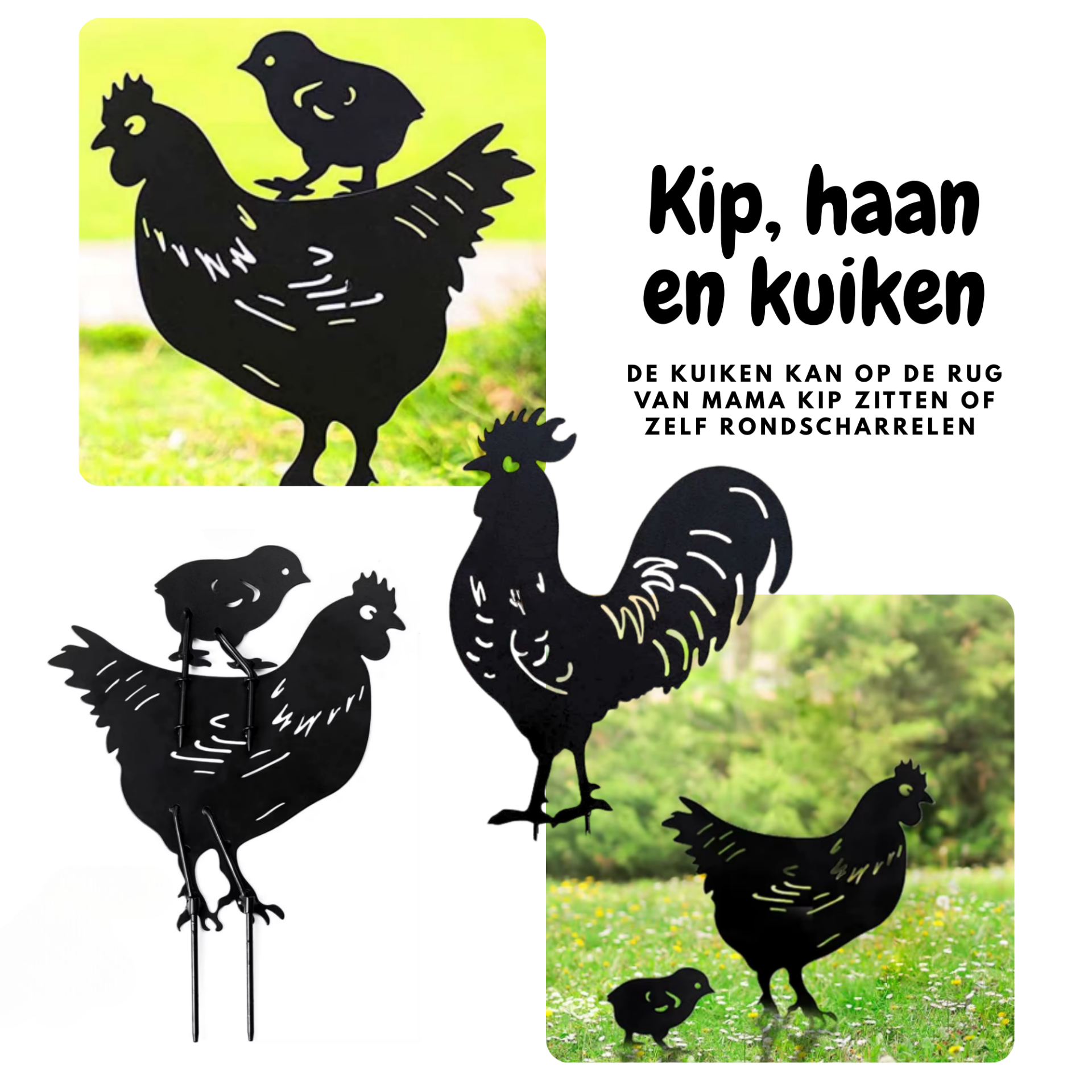 Haal de boerderijsfeer naar je eigen tuin met deze leuke kip, haan en kuiken set.
