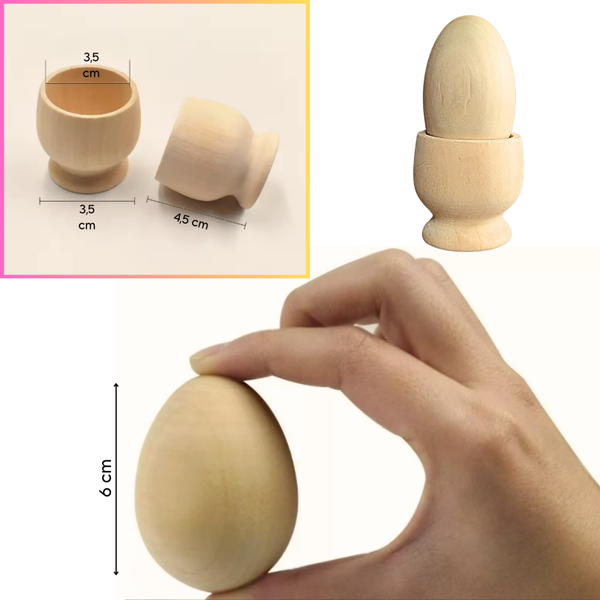 De houten eierdoppen hebben een diameter van 4 cm en zijn 3 cm hoog. De houten eieren hebben een hoogte van 6 cm en een diameter van 3 cm.