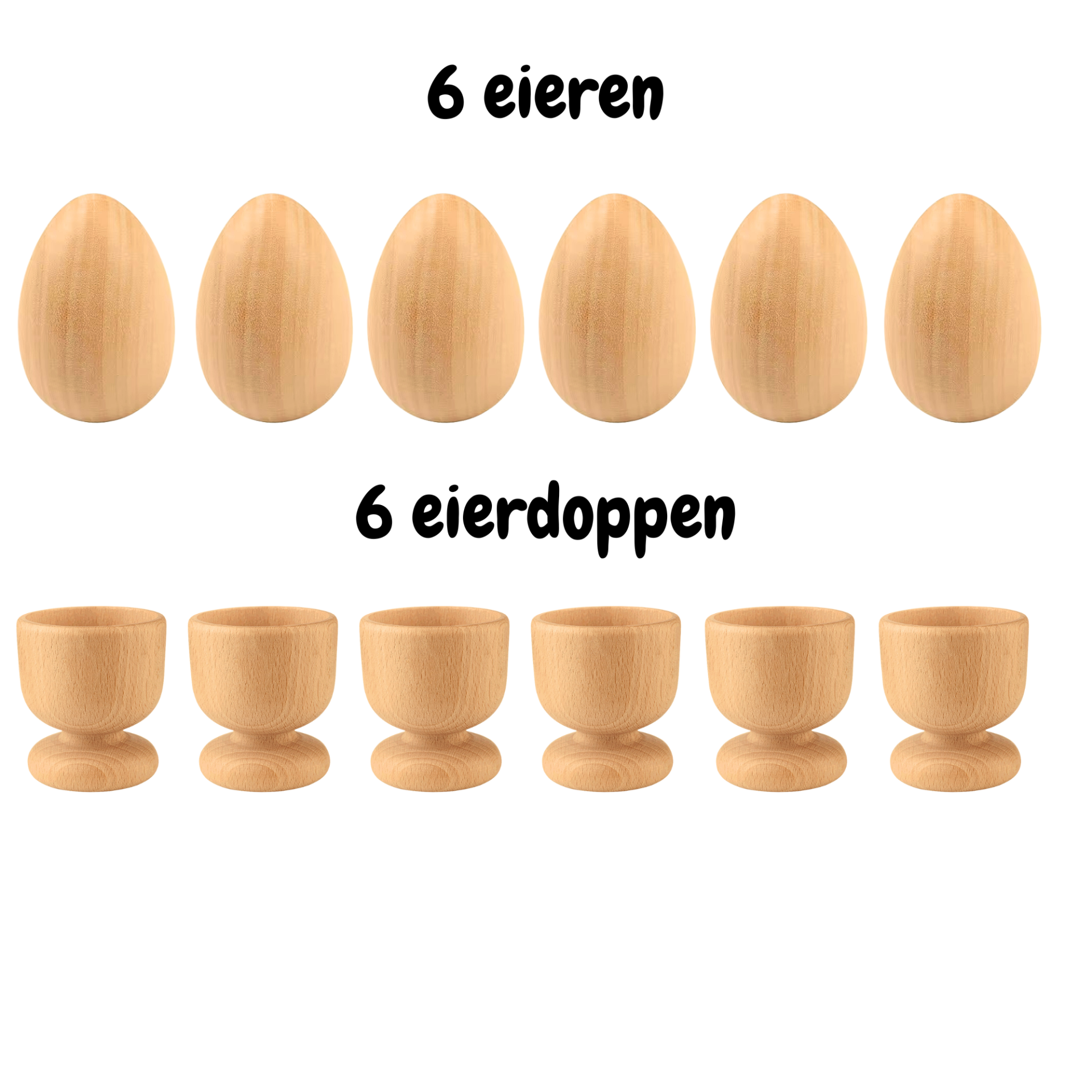 Set van 6 houten eierdopjes en 6 houten eieren van het merk Janse